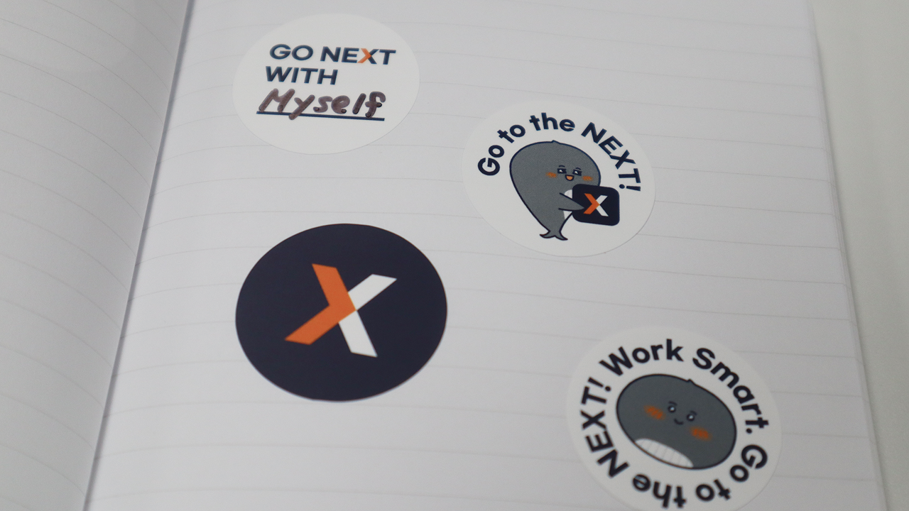 웰컴키트의 핵심 메시지인 'GO NEXT WITH OFFICENEXT'를 활용한 스티커를 제작했어요. 박스에 부착된 스티커에서 'OFFICENEXT'가 들어가는 부분은 빈칸으로 남겨두었는데요. 빈칸에는 여러분이 각자 함께 성장하고 싶은 것을 적어 여러분만의 스티커를 완성할 수 있도록 디자인했습니다.